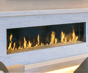 The breathtaking beauty and style of a DaVinci Custom Fireplace will create a dramatic focal point in any room. A sleek, contemporary profile features an all-glass viewing area that surrounds a ribbon of rich, dancing flames. DaVinci’s signature fire presentation draws you in with its striking presence of mesmerizing flames over a bed of Platinum reflective crushed glass with adjustable vibrant multi-color LED lighting.
